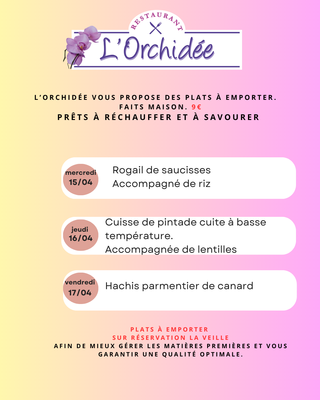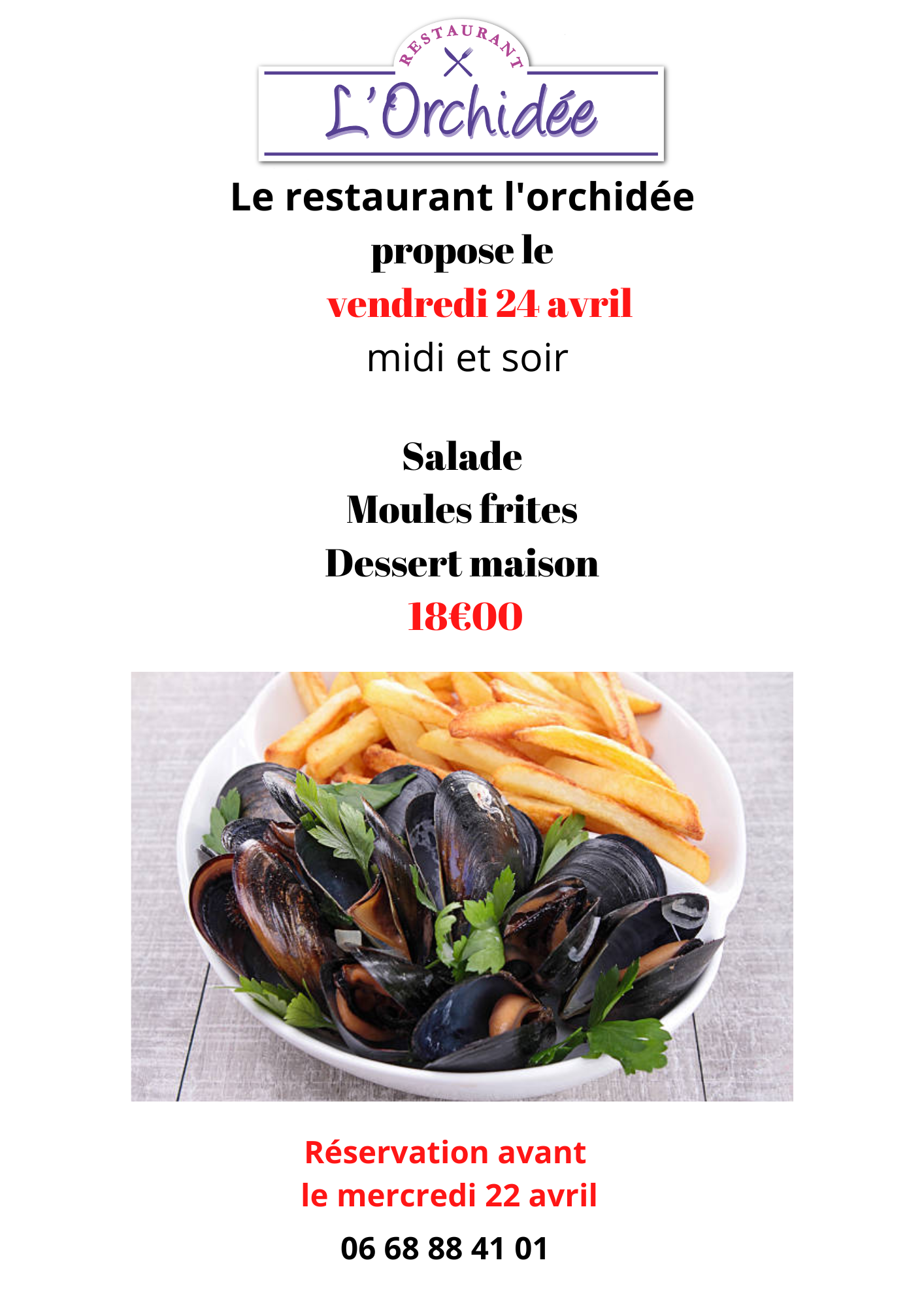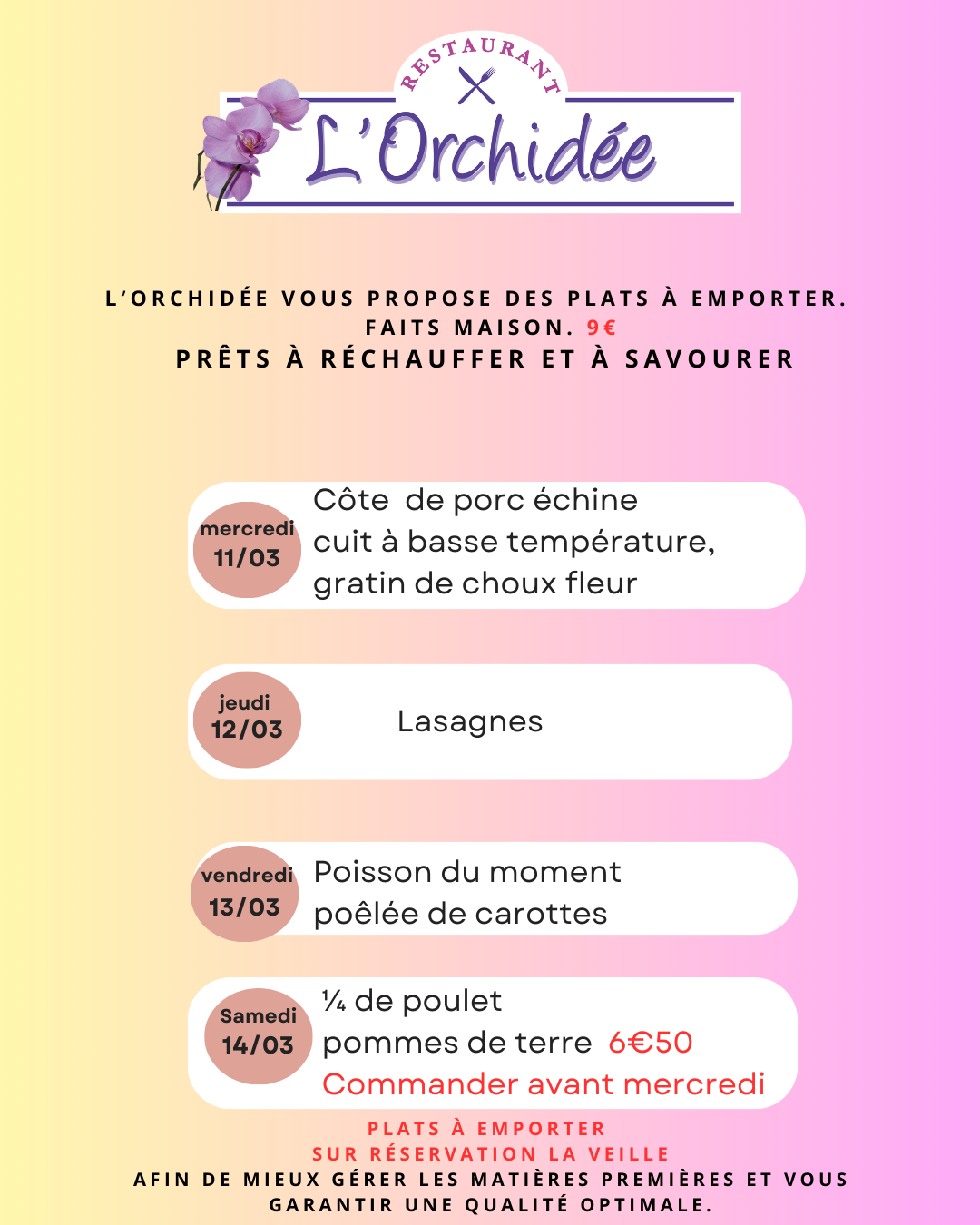 Nous vous proposons du mercredi midi au vendredi midi un menu du jour.